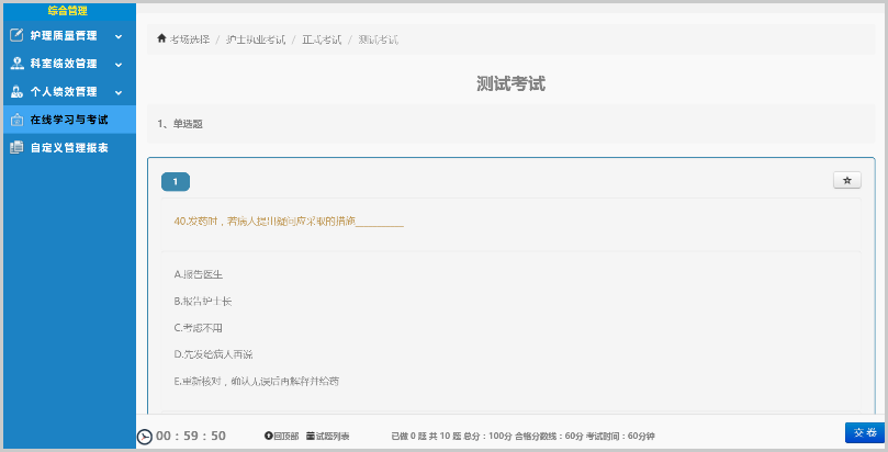 針對醫(yī)院等級評審和日常護理管理需要,護理在線學(xué)習(xí)與考試系統(tǒng),可以方便地完成全程在線學(xué)習(xí)、考試、統(tǒng)計以及持續(xù)跟蹤,試題設(shè)置、一鍵下發(fā),在線學(xué)習(xí)、省心省力。