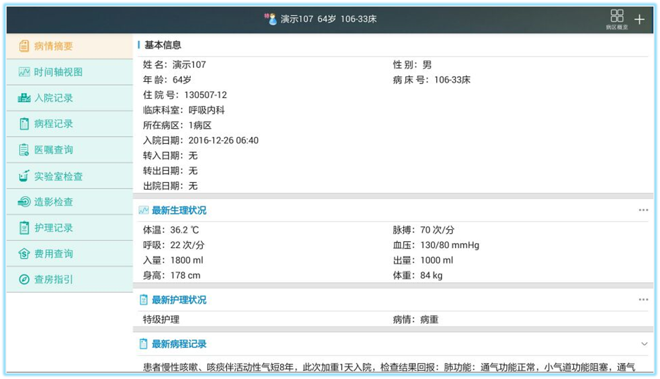 病情摘要——患者基本信息、最新生理狀況、護理狀況、病程記錄